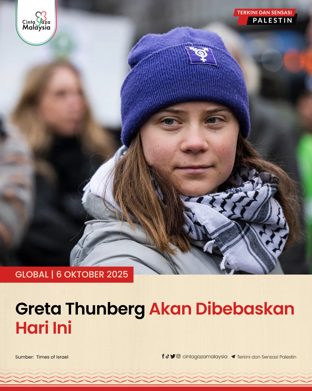 Aktivis Sweden, Greta Thunberg merupakan salah seorang diantara lebih 70 orang dari pelbagai kewarganegaraan yang akan meninggalkan Israel pada hari Isnin, 6 Oktober 2025 selepas mereka ditahan di atas kapal flotila bantuan Gaza yang telah dipintas.