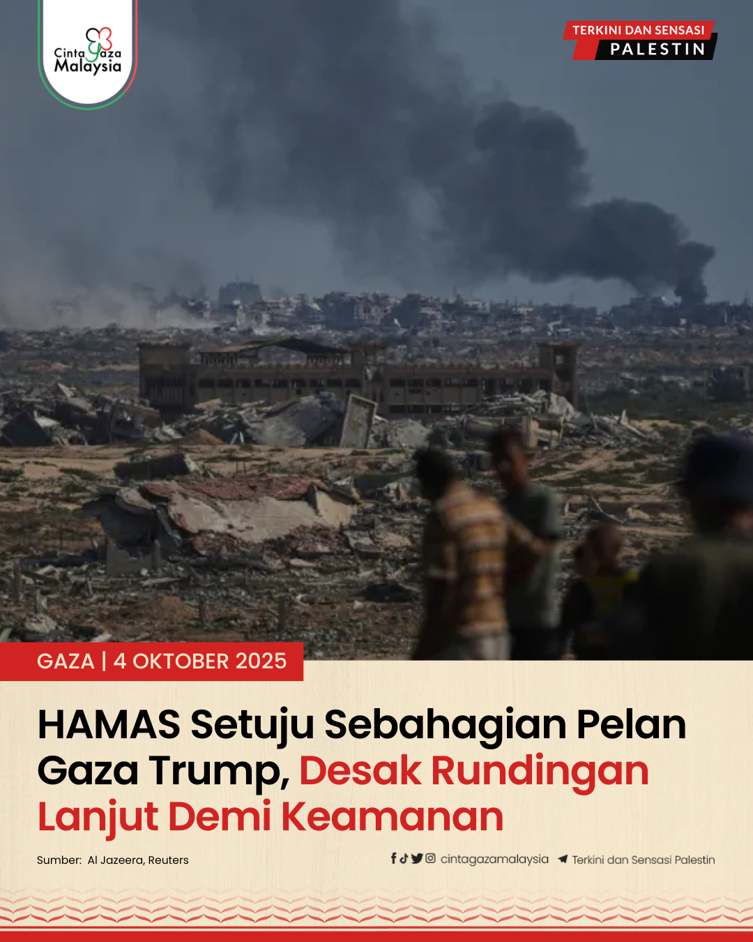 Suruhanjaya Siasatan PBB serta pakar hak asasi manusia antarabangsa telah menyimpulkan bahawa Israel melakukan jenayah genosid di Gaza, namun kerajaan Netanyahu tetap mempertahankan tindakannya sebagai langkah mempertahankan diri. Dalam respons HAMAS yang dilihat Reuters, kumpulan itu menolak pelucutan senjata dan menuntut pengunduran penuh serta-merta Israel dari Gaza, menunjukkan jurang besar antara kedua-dua pihak.